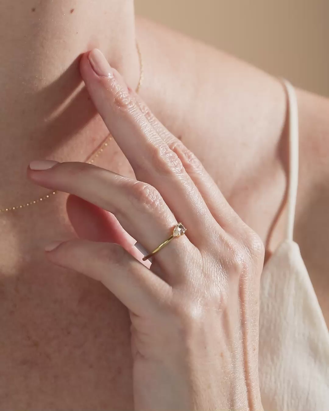 A one-of-a-kind ring set with six clawed prongs emerging from a half-moon base. This ring is thoroughly modern though vintage-inspired. To honor the earth and its natural resources, the design was handcrafted using sustainable practices and recycled gold. For customizations please schedule a consult with our designers here.