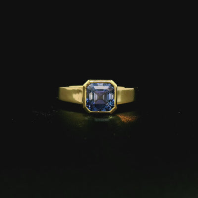 I've always been in love with Asscher's and to find this lot of blue sapphire asscher's was a dream. The flat band that meets the asscher in a beautiful gold bezel felt balanced and makes the ring comfortable and luxurious to wear.