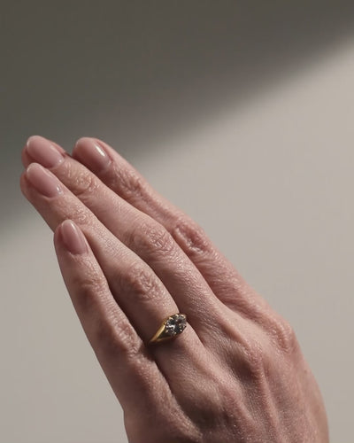 Evoking the quintessential signet setting, this brilliant cut oval diamond is held by eight clawed prongs, a signature style of ILA. With recycled gold and sustainable craftsmanship, this engagement ring is informed by a deep appreciation of the earth and its beauty.