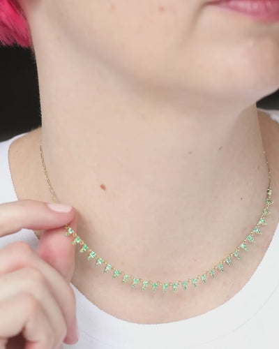 Drops of emeralds string around the neck in our Deja necklace. The necklace is versatile and can be worn with jeans and a t-shirt or our with a more formal outfit.
