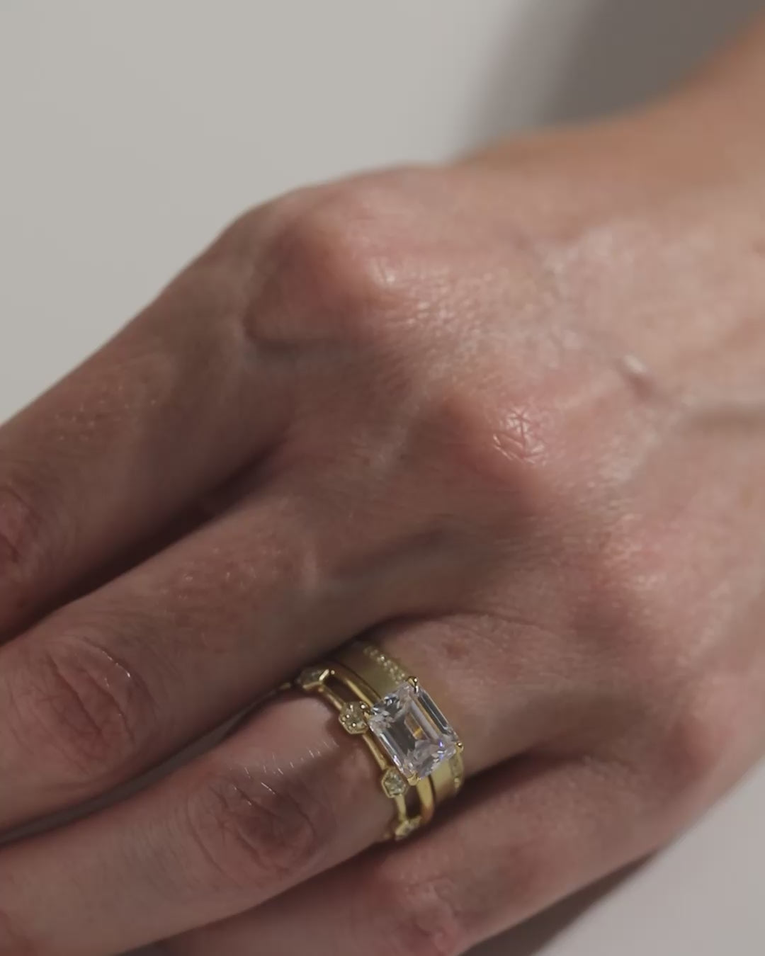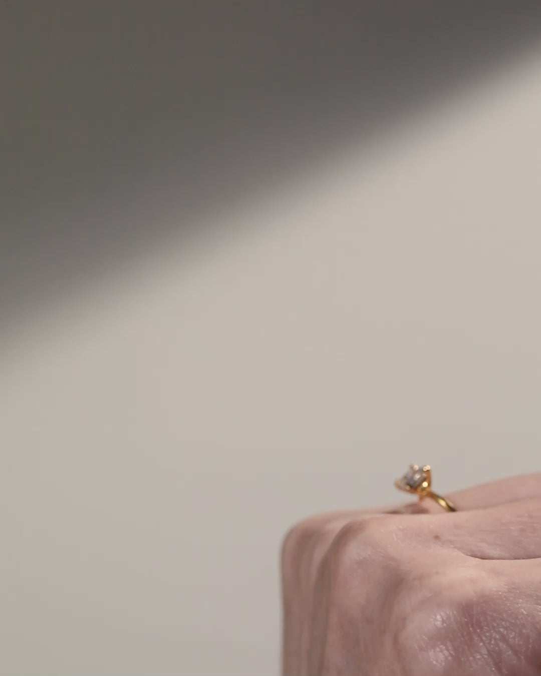 With a unique, east-west setting, a brilliant diamond is captured by six of our unique, clawed prongs. The ring is handcrafted using sustainable techniques and recycled gold.