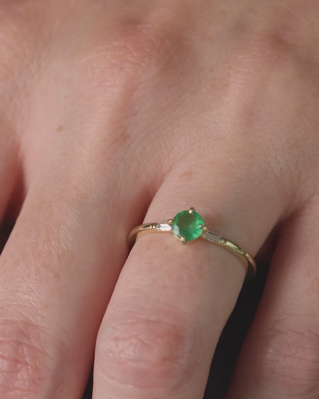 Subtlety and charm meet us in the middle when it comes to the Haritah. An illustrious round emerald sits between two twin baguette diamonds.