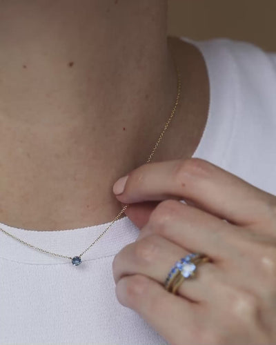 The most striking round sapphire set in our signature 6 prong gold setting. This is a beautiful everyday necklace.