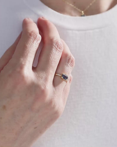 An ILA classic with an emerald cut Blue Sapphire set east-west and accented with diamond pave.
