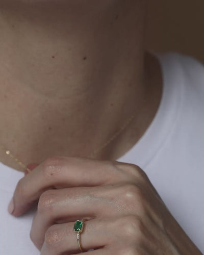 An ILA classic with an emerald cut Emerald set east-west and accented with diamond pave.
