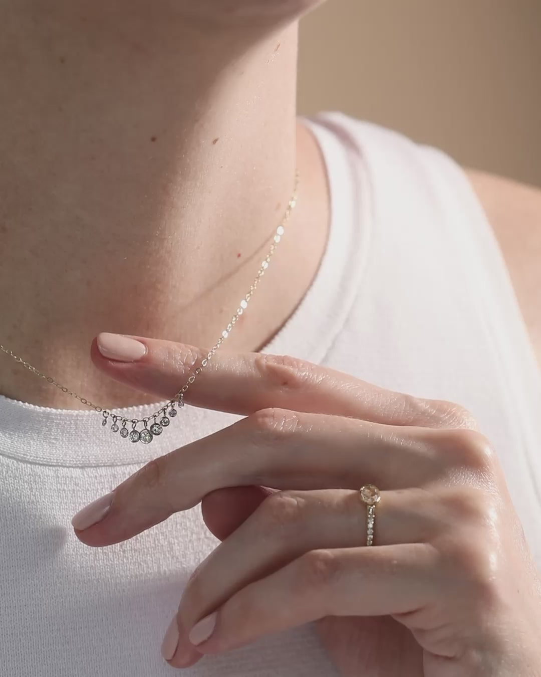 Dainty dew drops of diamonds set in 14K white gold setting and a yellow gold chain.