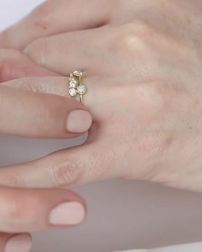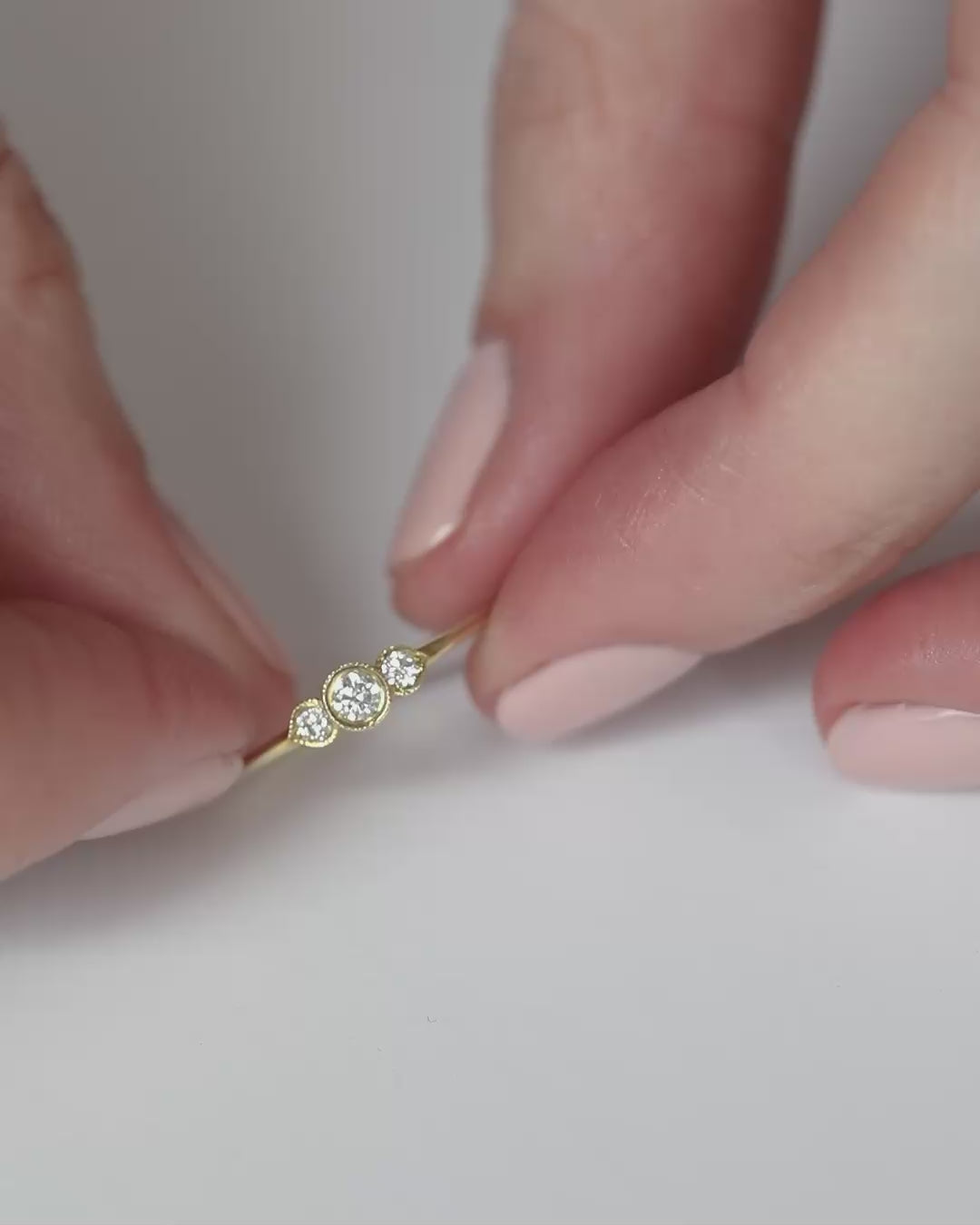 With recycled gold and sustainable craftsmanship in mind, a trio of diamonds, bezel set with elevated collars protects the gems while enhancing the precious look and feel of our Melika.