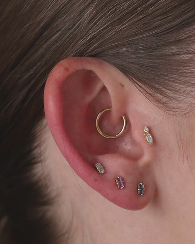 One of my favorite cuts, the baguette in cultivated lab diamond. I set this in my signature claw settings on the long edges. I designed this with the thought of adding interest to your classic diamond stud.