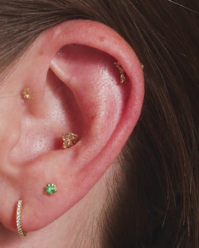 Three round diamonds flow along a curved line of gold. Simplicity and subtlety meet to give this stud a fluidity.