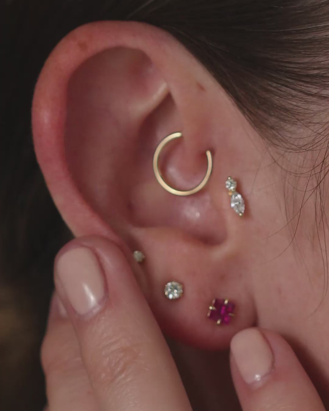 From our Primary Series Collection, a antique step-cut ruby is held by our signature North-South-East-West claw setting. Our martini style setting allows the Primary Princess to sit flush on the ear for a low profile look.