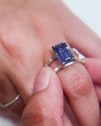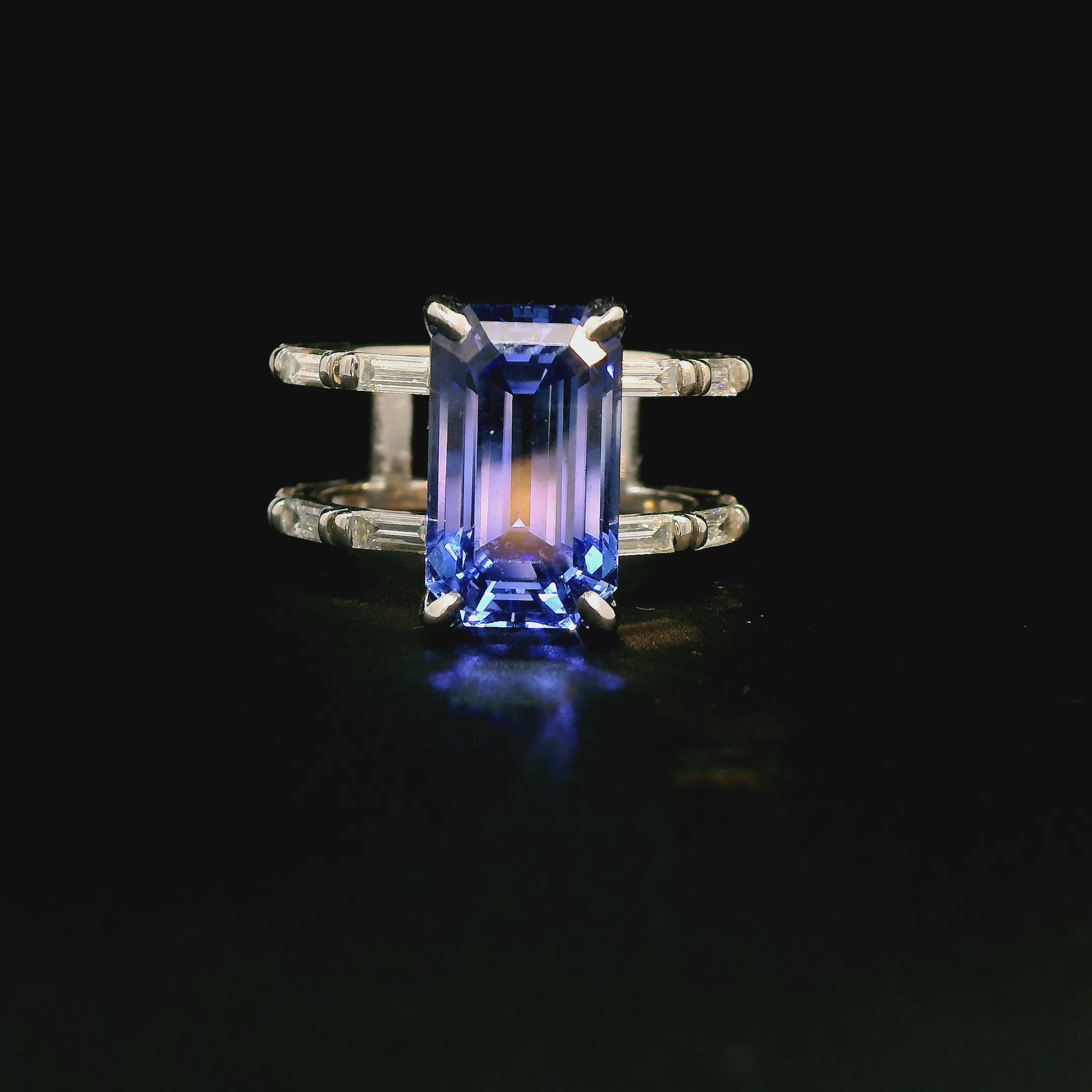 This ceylon blue sapphire is from our private collection. The elongated nature of this sapphire makes this ring so special. We use our in-house setting technique to add baguettes in the double bands.