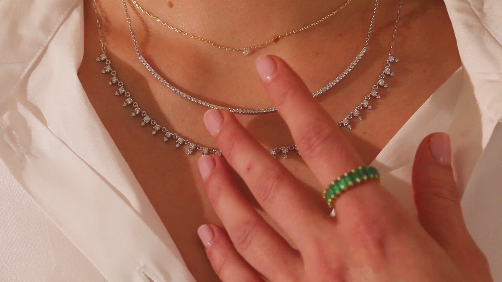 A single pinholed diamond freely floats at the bottom of the chain.